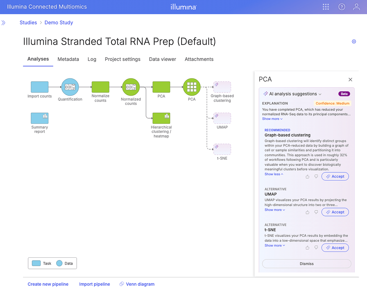With the v1.1 release of Illumina Connected Multiomics, we’re adding AI‑assisted suggestions, our first step toward guided workflow construction.