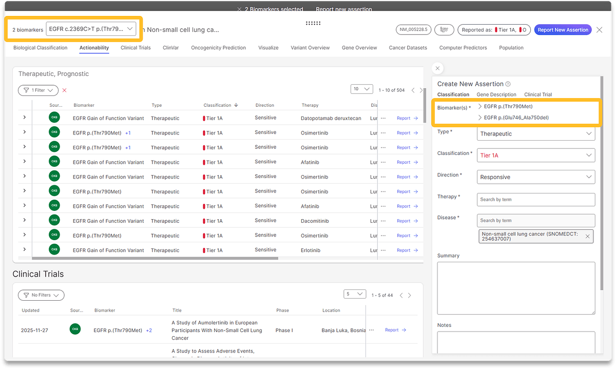 The biological landscape of a tumor is rarely defined by a single mutation. To capture this complexity, version 5.3 enhances variant interpretation through the ability to create and view co-occurring biomarker evidence. This feature allows researchers to identify and consider the interplay between multiple biomarkers, providing a more holistic understanding of the tumor profile and potential therapy resistance.