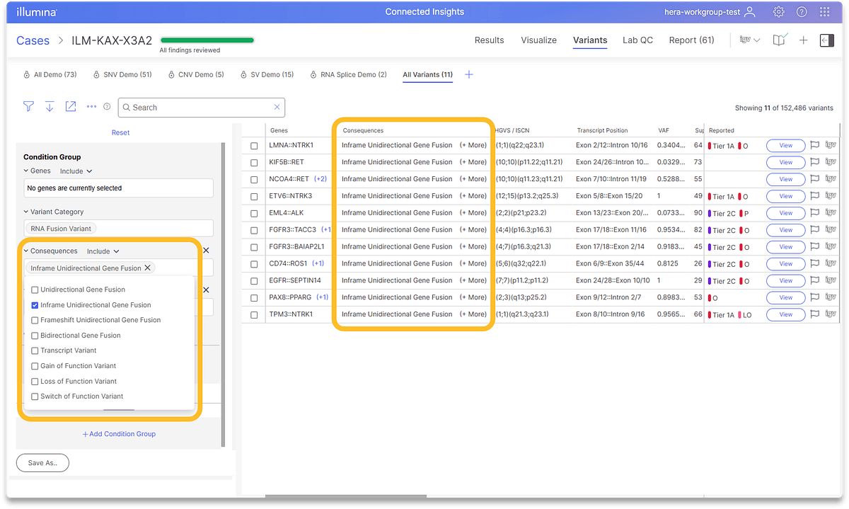 Connected Insights v5.3 is bringing new interpretation capabilities for fusions, now automatically identifying fusions as inframe or frameshift to enable easy filtration based on fusion type for focused analysis.