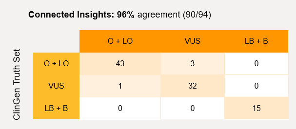 One of the most significant challenges in oncology research is the burden of VUS - the overwhelming number of variants of uncertain significance, lacking literature or evidence to properly classify actionability. Connected Insights offers automated, guidelines-based oncogenicity classification of variants, integrating proprietary Illumina PrimateAI-3D and SpliceAI algorithms to empower users to achieve greater variant classification accuracy and confidence in their insights. In version 5.3, we have further optimized our automated oncogenicity prediction functionality, reaching 96% accuracy.