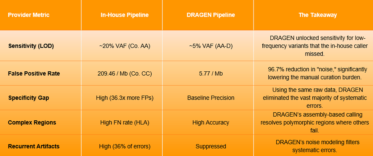 - Lowering the Noise Floor for Higher Sensitivity: Sensitivity, the ability to find a variant, is often limited by a pipeline's inability to manage noise. When pipelines use overly aggressive "hard filters" to avoid false positives, they inadvertently bury true low-VAF variants. DRAGEN’s probabilistic noise modeling and support for UMI collapsing, allows it to characterize artifacts at runtime, effectively lowering the noise floor. This allows the pipeline to "see" and confidently call low-frequency variants that other methods are forced to discard as noise.
