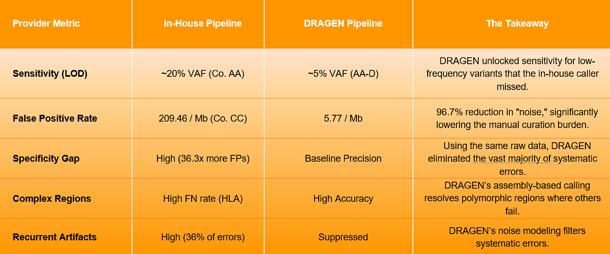- Superior Analytical Sensitivity: DRAGEN maintained high sensitivity for variant detection with a 95% detection threshold as low as ~1% to 1.6% VAF — a benchmark achieved on the Company CC (CancerSCAN™) and Company DD (TSO500) datasets at a median depth of 800x–1,000x. This significantly outperformed some in-house methods that had "blind spots" for low-frequency variants, with one provider failing to consistently detect variants below a 20% allele frequency.