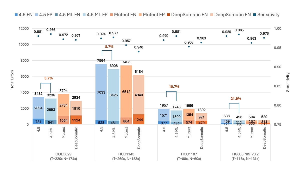 DRAGEN v4.5 introduces ML‑driven somatic small‑variant calling, improving analytical sensitivity and specificity across a wide range of tumor types. By learning complex signal patterns in noisy data, this approach improves true variant detection while maintaining high precision even in challenging sample types without increasing runtime. As shown in Figure 2, ML‑driven somatic SNV calling in DRAGEN v4.5 consistently reduces total errors relative to the non‑ML v4.5 caller and delivers the highest analytical sensitivity across all four benchmark cell lines, including the latest NIST HG008 benchmark [1]. In contrast to third‑party tools, DRAGEN exhibits markedly fewer false‑negative errors, driving superior sensitivity without inflating overall error counts.