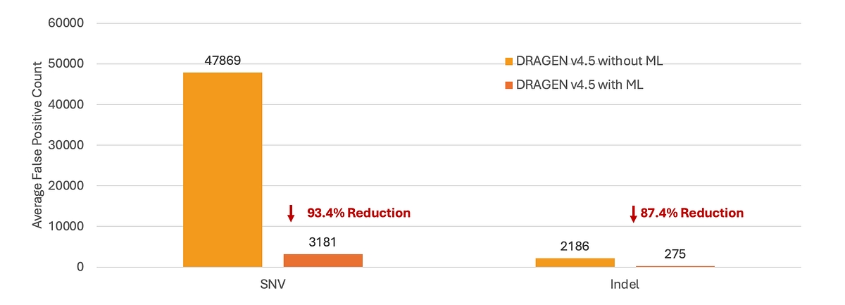 Somatic variant calling in DRAGEN v4.5 includes targeted improvements for FFPE samples, reducing artifacts introduced during sample preparation. Using optional ML‑based somatic score recalibration, DRAGEN v4.5 dramatically suppresses FFPE‑driven false positives without relying on rigid hard filters. In a normal‑vs‑normal FFPE benchmark where all calls are artifacts, ML reduces false positives by 93.4% for SNVs and 87.4% for indels (See Figure 3). This substantial reduction effectively eliminates the FFPE noise floor, enabling cleaner VCFs and more confident detection of true low‑frequency somatic variants in degraded tumor samples.