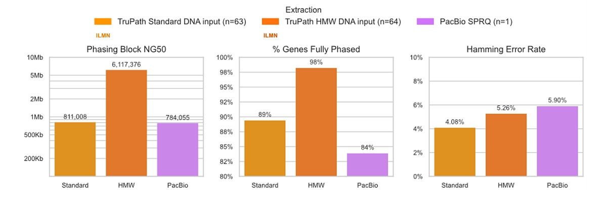 Figure 4: Comparison of phasing performance for TruPath Genome in DRAGEN v4.5 and PacBio across standard and high‑molecular‑weight (HMW) DNA inputs. [3]