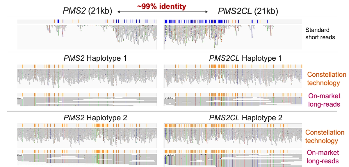 In the PMS2 locus, which shares ~99% sequence identity with its pseudogene PMS2CL across ~21 kb, conventional short reads collapse signal across paralogs, whereas MRJD in v4.5 cleanly separates gene‑ and pseudogene‑specific haplotypes. As shown in the PMS2 example, DRAGEN reconstructs distinct haplotypes for PMS2 and PMS2CL with concordance comparable to on‑market long‑read technologies, enabling accurate variant attribution without specialized sequencing assays (See Figure 6). This substantially reduces false positives and misassigned variants in biologically important duplicated genes, expanding the set of regions that can be analyzed confidently using standard WGS data.