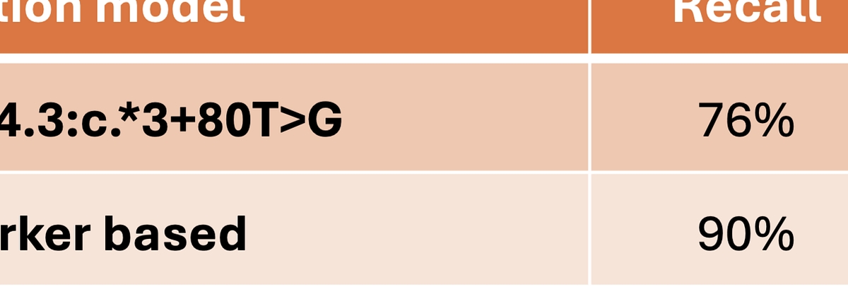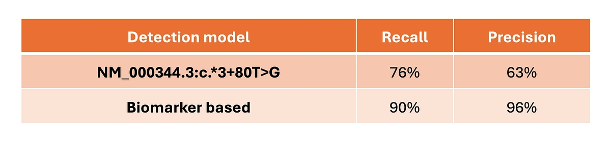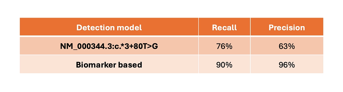 Table 1: Performance comparison of SMN1 silent carrier detection, tested over 3202 1kg samples, using the legacy single‑SNP marker (NM_000344.3:c.*3+80T>G) and the DRAGEN v4.5 biomarker‑based SMN1 duplication haplotype caller.*