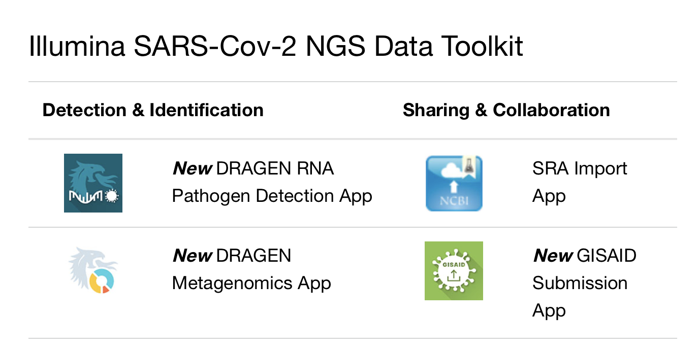 These tools make it simpler for researchers to detect and identify the SARS-CoV-2 viral sequence in their samples, and contribute their findings to critical public databases. Learn more about the new DRAGEN Apps released in the Illumina SARS-CoV-2 NGS Data Toolkit. This coronavirus detection and identification software is available to the community free of charge on BaseSpace Sequence Hub.